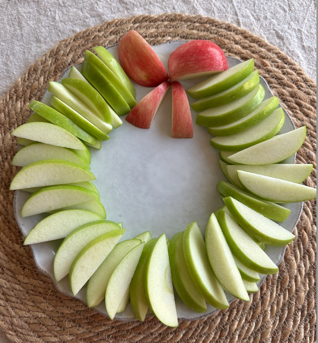 If you need a fast, festive snack this season, this Holiday Caramel Apple Wreath is one of my favorites to make. It looks beautiful on the table, comes together in minutes, and is always a hit with kids and adults. I use crisp green Granny Smith apples for the “wreath” and a red Honeycrisp apple to create the bow on top — such a simple trick, but it makes the whole plate feel instantly holiday-ready.