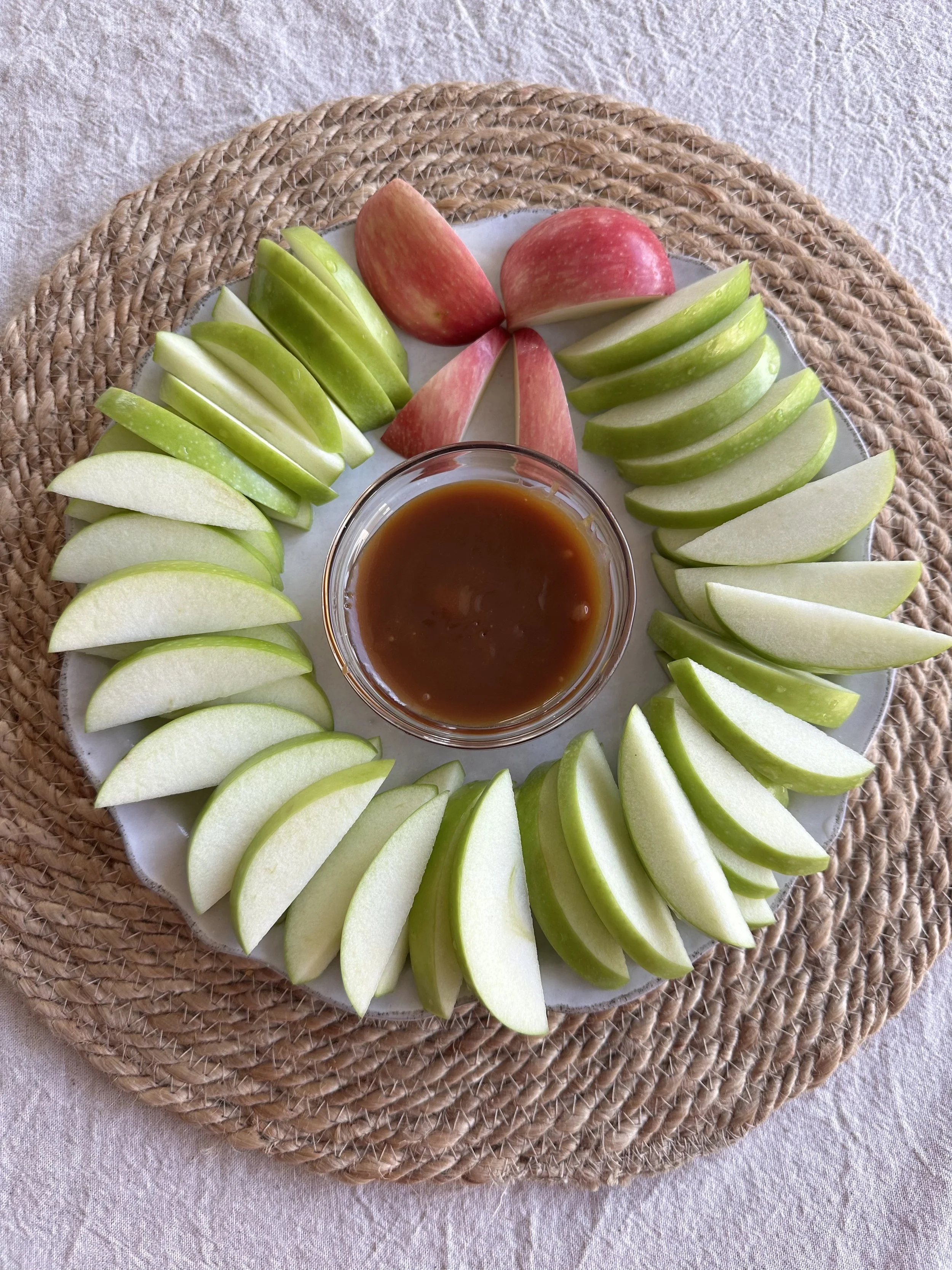 Add caramel dip to the center and serve immediately or refrigerate until ready to eat.