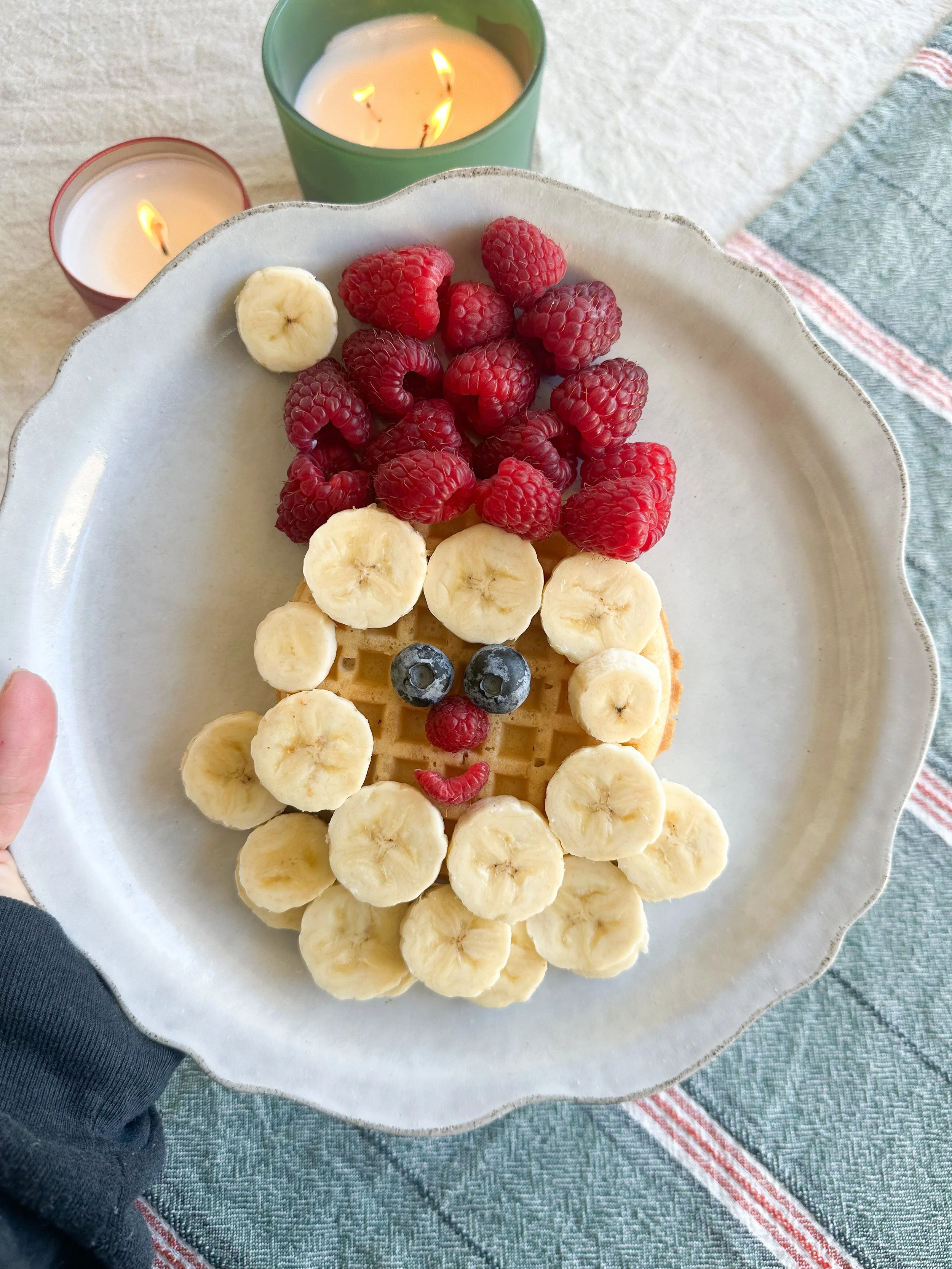 If you’re looking for a quick holiday breakfast your kids will actually get excited about, this Santa waffle is the perfect December morning win. It starts with a gluten-free frozen waffle (I used Trader Joe’s!) and turns into the cutest little Santa face using nothing more than fresh fruit. No cooking skills required — just a few minutes and a little creativity.